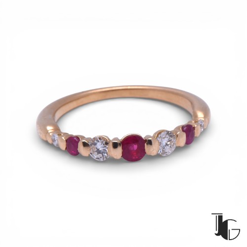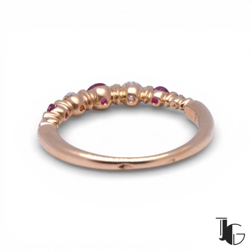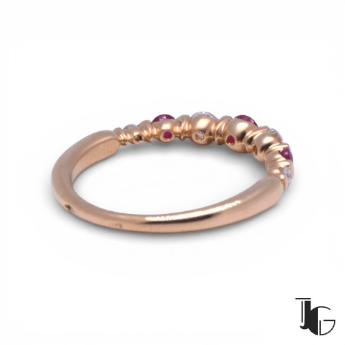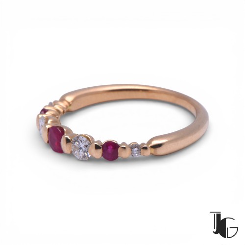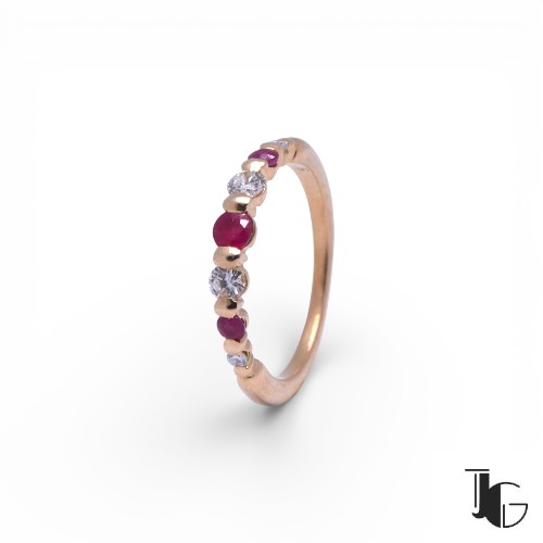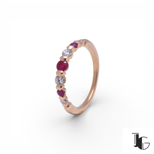 Cette alliance avec rubis et diamants présente une ligne fine et équilibrée, pensée pour un port quotidien. La composition alterne pierres de couleur et diamants, dans un rythme régulier et lisible.