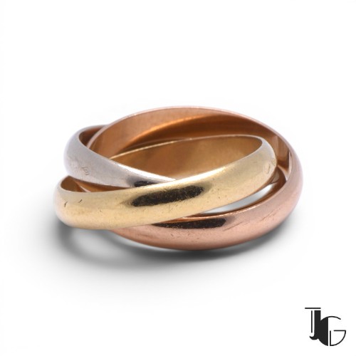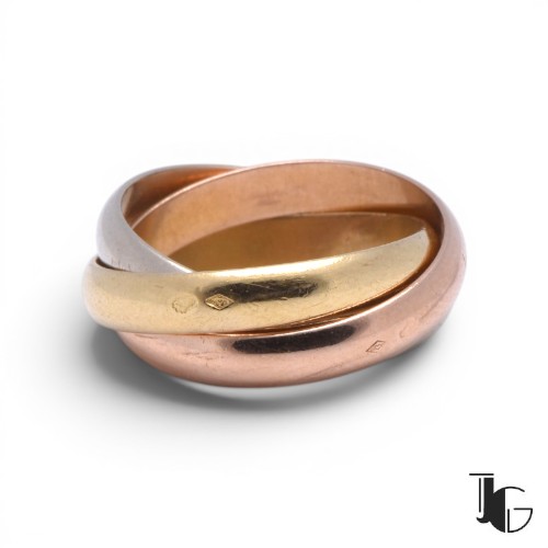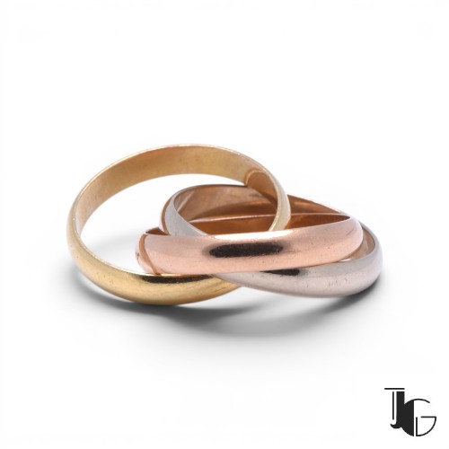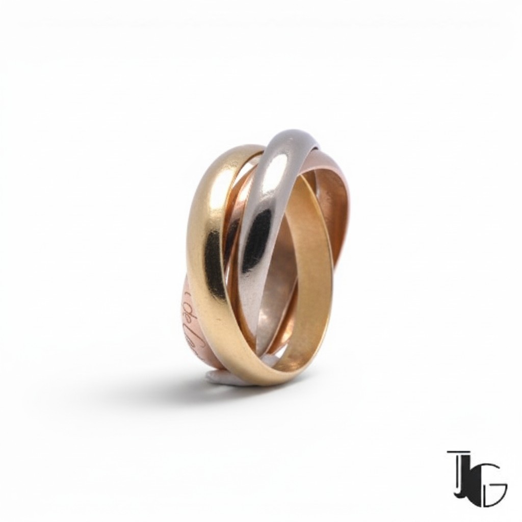 Cette bague Cartier Trinity reprend l’un des modèles les plus emblématiques de la maison Cartier. Composée de trois anneaux entrelacés en or jaune, or blanc et or rose, elle forme un ensemble fluide qui accompagne naturellement le mouvement de la main.