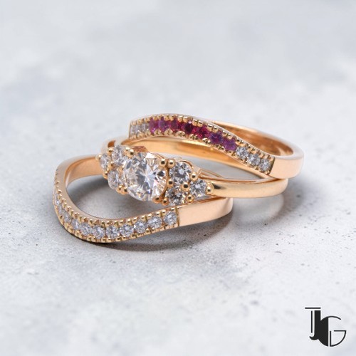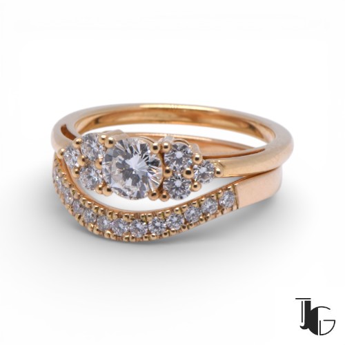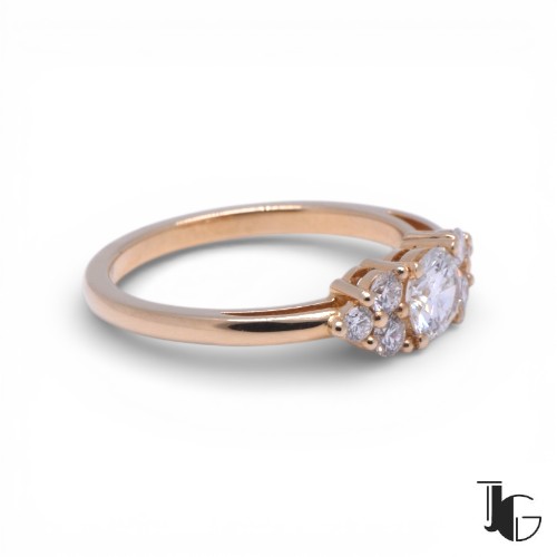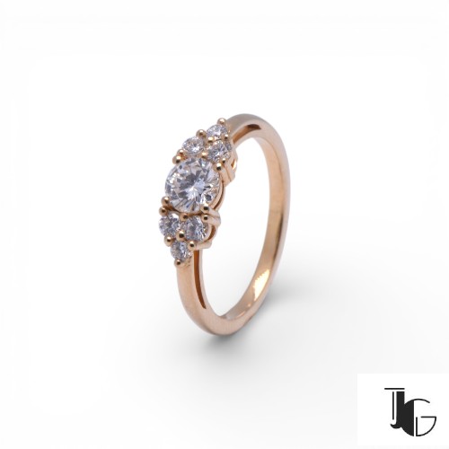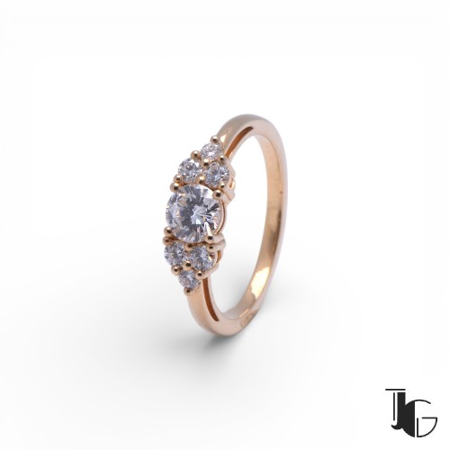 L’ensemble offre un bel équilibre entre présence et finesse. Le diamant central donne du relief à la bague. Les diamants placés sur les côtés renforcent la lumière et accompagnent naturellement la pierre principale. La monture reste sobre, ce qui permet aux pierres d’occuper toute la place.