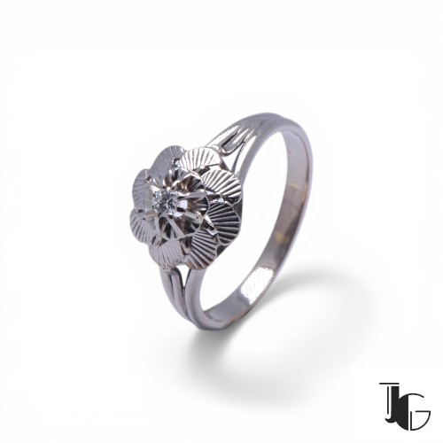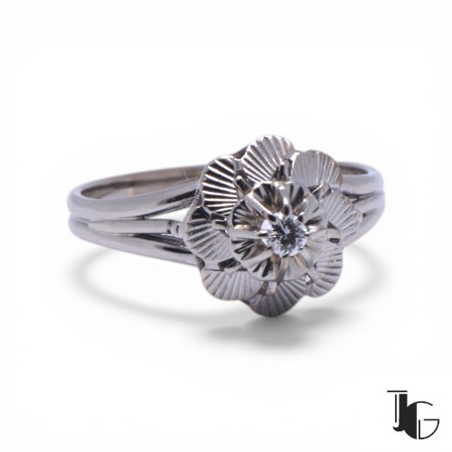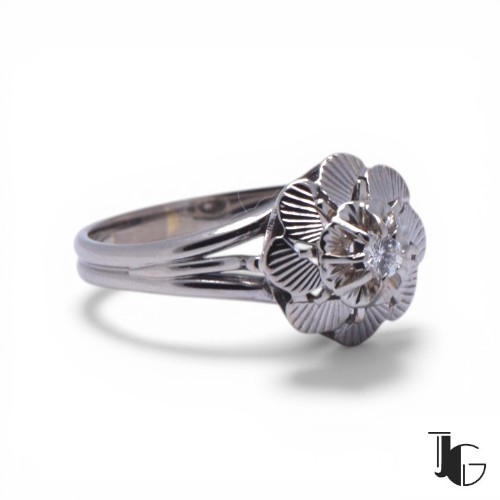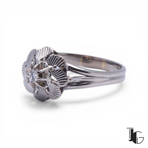 Cette bague fleur diamant ancien présente un motif floral sculpté dans le métal. La monture forme une fleur travaillée en relief, avec un diamant au centre qui capte la lumière.