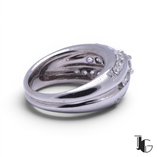 Cette bague jonc diamants présente un volume généreux et une construction en trois lignes qui donne une forte présence au doigt. La monture large structure le bijou et met en valeur l’ensemble des pierres.