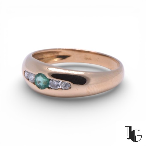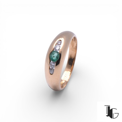Les diamants apportent de la lumière et équilibrent la composition. Leur éclat contraste avec la couleur de l’émeraude et souligne la forme douce du jonc. L’ensemble reste sobre et facile à porter au quotidien.