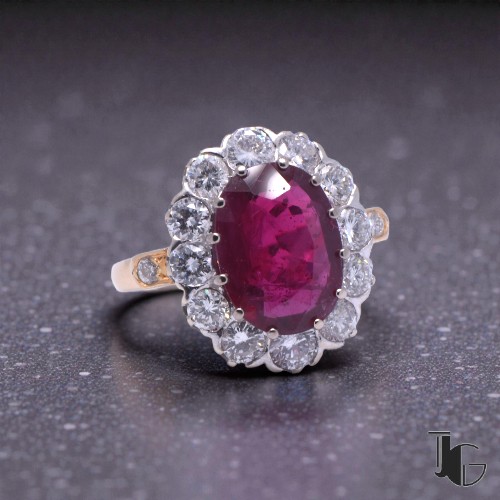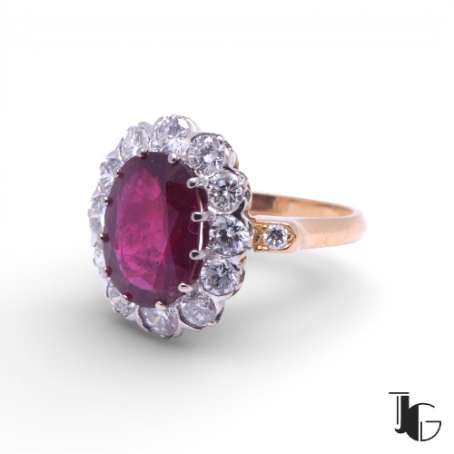 Le rubis est entouré de diamants taille brillant, sertis griffes, pour un total de 1.40 carat. L’entourage crée un contraste net et met en valeur la pierre centrale sans la masquer. La disposition régulière des diamants renforce la lisibilité du motif pompadour.