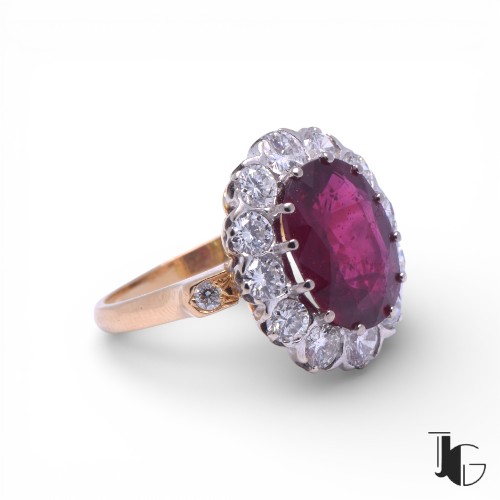 Au centre, un rubis ovale de 3.82 carats est serti de douze griffes. La pierre est certifiée naturelle par le laboratoire Bellerophon. Sa teinte soutenue et sa taille ovale assurent une présence franche sur la main, avec une bonne diffusion de la couleur.
