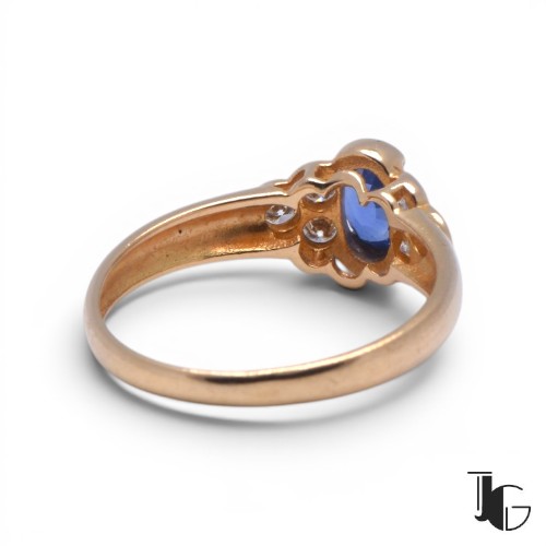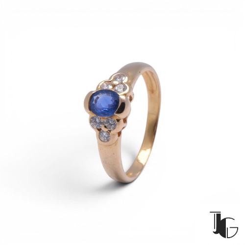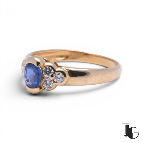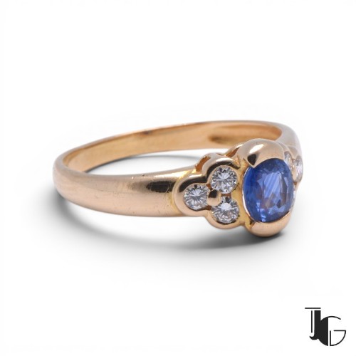 Cette bague est ornée d’un saphir de Ceylan au centre, entouré de diamants qui apportent de la lumière à l’ensemble. La pierre, taillée en ovale, présente une belle couleur bleue avec des nuances visibles selon la lumière.