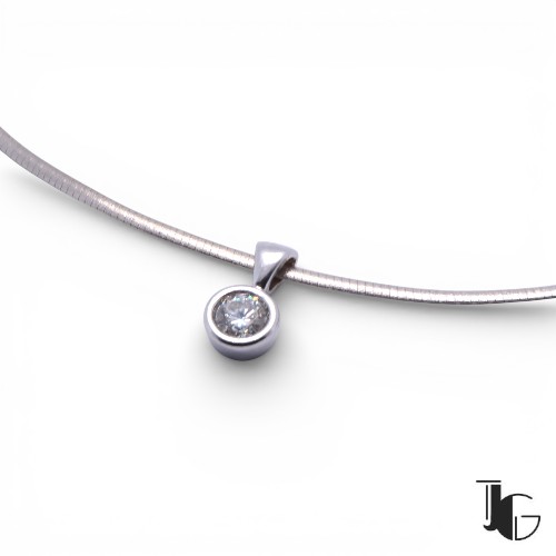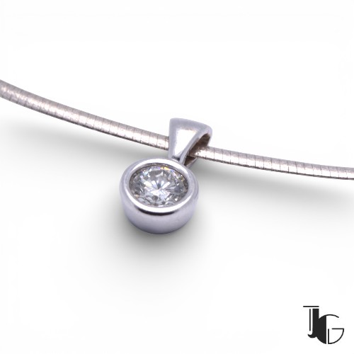 Le pendentif est orné d’un diamant taille brillant de 0.70 carat, serti clos. Ce type de sertissage entoure complètement la pierre et assure une bonne protection des arêtes. Il souligne également la forme du diamant et renforce sa présence visuelle.