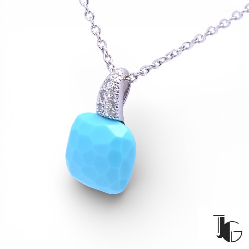 La bélière est pavée de sept diamants sertis en pavage, pour un total de 0.35 carat. Les diamants apportent un contraste lumineux avec la couleur franche de la turquoise. Leur implantation reste mesurée et parfaitement intégrée à l’ensemble du pendentif.