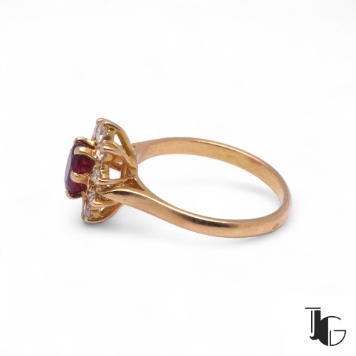 Cette bague marguerite rubis et diamants met en valeur un rubis ovale de 5.2 x 4.1 mm au rouge vif, serti de griffes en or jaune. La pierre centrale est entourée de dix diamants totalisant 0.30 carat, formant une corolle éclatante typique du style marguerite.