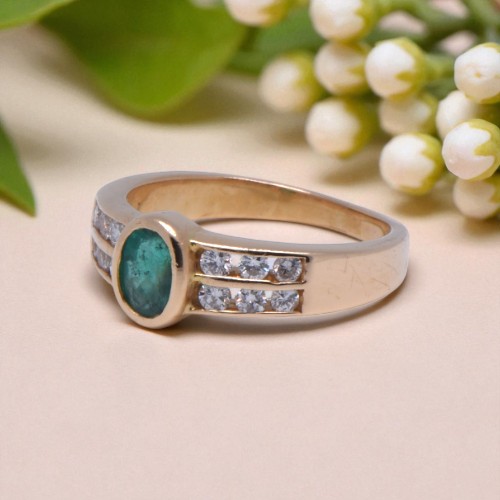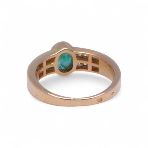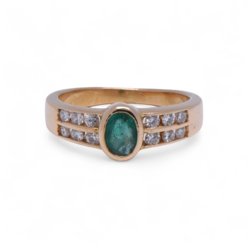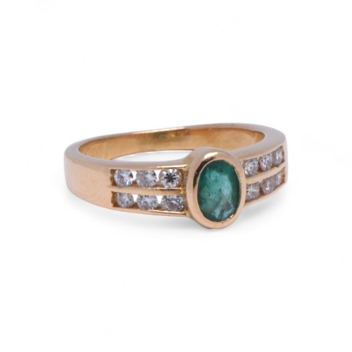 Or jaune 750/1000, émeraude ovale 6 x 4 mm, 12 diamants sertis rail 0.24 carat H-VS, poids total du bijou 4.16 grammes.Référence : P641