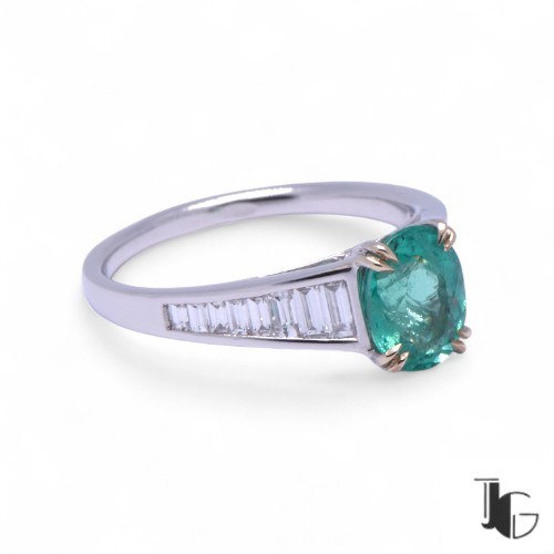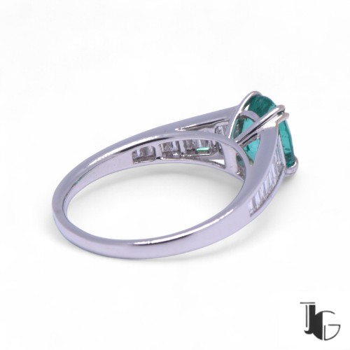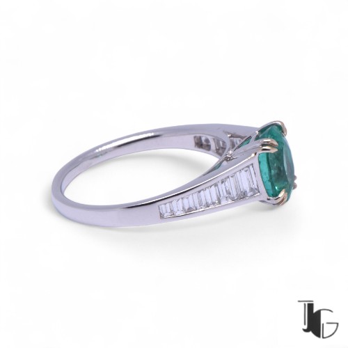 Or blanc 750/1000, émeraude ovale 1.32 carat sertie griffes or jaune, 2 lignes de diamants baguette 0.53 carat G-VS, poids total du bijou 2.92 grammes.Référence : G114