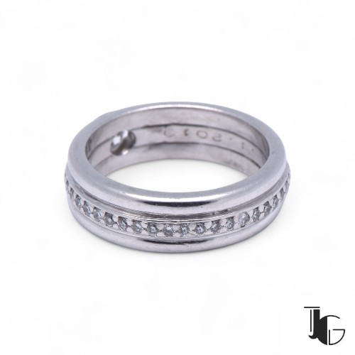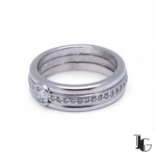 Or blanc 750/1000, diamant central 0.25 carat, ligne de diamants tour complet total 0.35 carat H-VS, poids total du bijou 6.82 grammes.Référence : P692