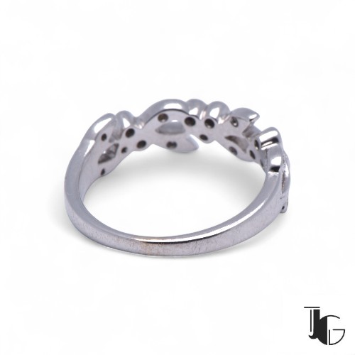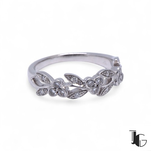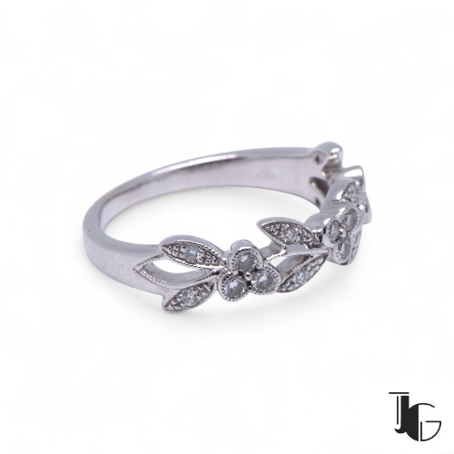 Or blanc 750/1000, motif floral ajouré serti de diamants total 0.25 carat G-VS, poids total du bijou 2.20 grammes.Référence : P685
