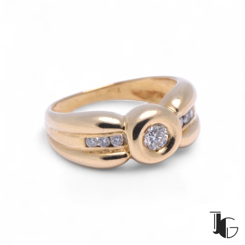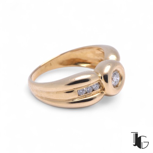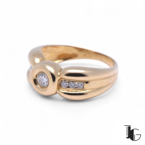 Or jaune 750/1000, diamant central 0.20 carat serti clos, 4 diamants d’épaules total 0.16 carat G-VS, poids total du bijou 5.87 grammes.Référence : P736