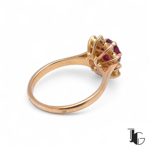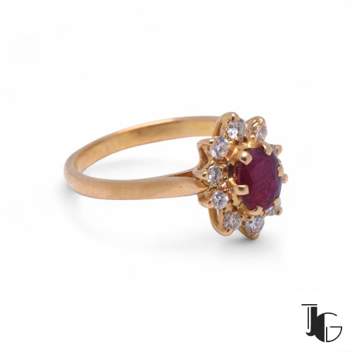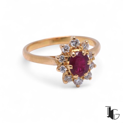 Or jaune 750/1000, rubis ovale 5.2 x 4.1 mm, entourage 10 diamants total 0.30 carat G-VS, poids total du bijou 2.97 grammes.Référence : P327