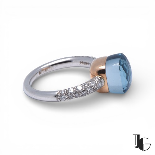 Or blanc et or jaune, topaze bleue taille briolette, diamants pour un total de 0.45 carat G VS, poids total du bijou 5.19 grammes.Référence : R82